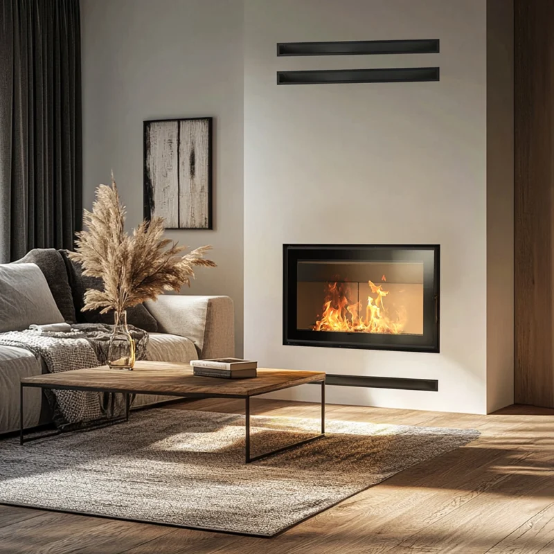 Dominantou vložky je velké dekorativní sklo, které umožňuje krásný a ničím nerušený pohled na plameny. Moderní konstrukce spalovací komory je navržena tak, aby zajistila efektivní spalování a maximální využití energie ze dřeva. Obložení spalovací komory z akumulačního materiálu pomáhá udržovat vyšší teplotu v ohništi a přispívá k čistějšímu hoření.